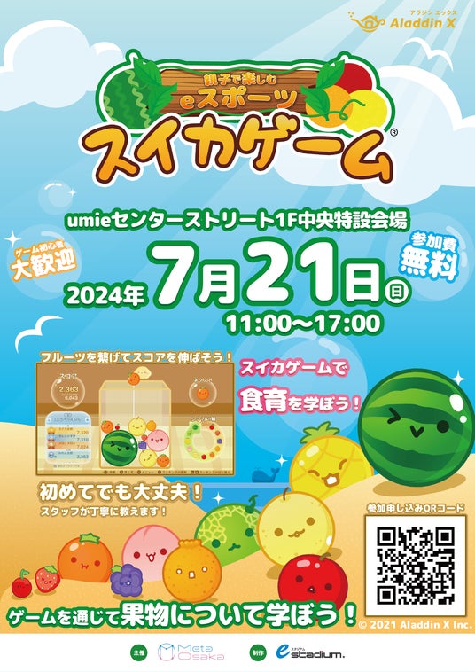 デジタル空間やeスポーツを活用して地域課題を解決する株式会社Meta Osaka(所在地:大阪府大阪市、代表取締役:毛利英昭、以下「当社」)は、2024年7月21日(日)、神戸・ハーバーランド「umie」(所在地:神戸市中央区東川崎町)で親子で楽しむeスポーツイベント「スイカゲーム」と「AIアート体験」を開催します。eスポーツやAIアートを通じて、子どもたちに新しい学びの機会を提供し、食育を促進することを目的としています。