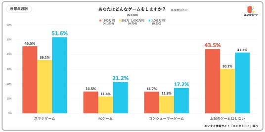 世帯年収別で見ると、どのゲームにおいても世帯年収1,001万円~の人の回答が最も多くなるという結果になりました。特に、「スマホゲーム」では50%以上、「PCゲーム」では20%以上の回答を集めており、日常的にこれらのゲームをする人が少ない501万~1,000万円の層と大きな差がついています。「PCゲーム」の場合は快適にプレーできる環境を整えるだけでも安くない金額がかかるため、高年収世帯では趣味・娯楽に惜しみなく資金を投じられる人が多いのかもしれません。また、1,001万円~の層では自分の働き方に自由な裁量がある人も多く、ゲームなど娯楽に充てられる時間が確保しやすくなっている可能性も推察されます。