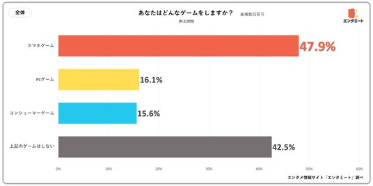 全国の10代~50代の男女を対象に、「あなたはどんなゲームをしますか?」というアンケートを実施したところ、最も多かった回答は「スマホゲーム」で47.9%でした。次いで、「PCゲーム」が16.1%、「コンシューマーゲーム」が15.6%で続くという結果になりました。また、「上記のゲームはしない」と回答した人は42.5%となり、60%近くの人が日常的にゲームをしていることがわかりました。
