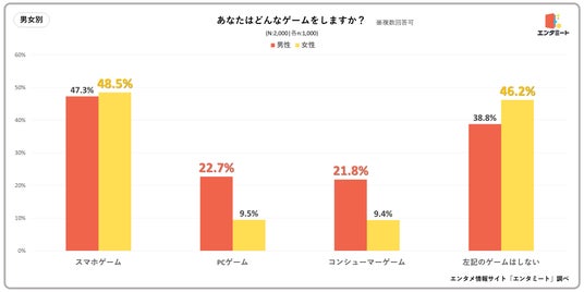 PCゲームのプレー率は16.1%、コンシューマーゲームは15.6%だった。性別や年代による違いも明らかになり、特にスマホゲームは全世代で人気があるが、PCゲームやコンシューマーゲームは男性や30代に多い傾向が見られた。