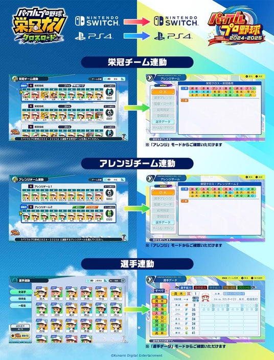 また、配信中のモバイルゲーム『パワフルプロ野球 栄冠ナイン クロスロード』(以下、『パワプロ 栄冠クロス』)が、家庭用ゲーム(Nintendo Switch(TM)、PlayStation(R)4 )としても配信開始!モバイル版とのデータ連携(※)が可能となり、家でも旅行先でも、場所を問わず『パワプロ 栄冠クロス』を楽しめます。また、本日発売の『パワプロ2024』との連動も可能です。