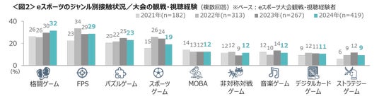 eスポーツの大会の観戦・視聴経験が高いジャンルは、「格闘ゲーム」「FPS」「パズルゲーム」がTOP3。初心者でも楽しめるようになったストリートファイター6の影響からか「格闘ゲーム」は高まっている。<図2>