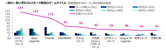 ゲームタイトルを呈示せずに、eスポーツ競技で行われているゲームタイトルを聴取した。「ストリートファイターシリーズ」154人、「Apex Legends」132人、「Fortnite」113人が思い浮かぶeスポーツゲームとしてあげている。年代別には、40代「ストリートファイターズシリーズ」、15~19歳と20代は「Apex Legends」、15~19歳「Fortnite」の想起率が高い。<図4>