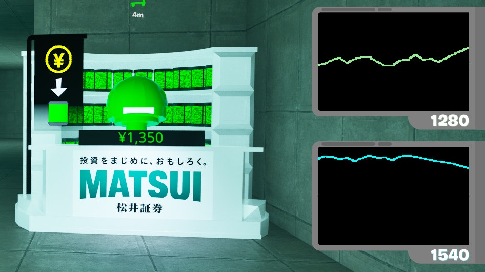 「MONEY TRADE FIGHT by 松井証券」は、ダンジョン内で収集したアイテムを元手に、価格変動する「カブー」を売買してゲーム内マネーを戦略的に増やしながら制限時間内にダンジョンを脱出し、最終的な獲得金額を競うゲームです。