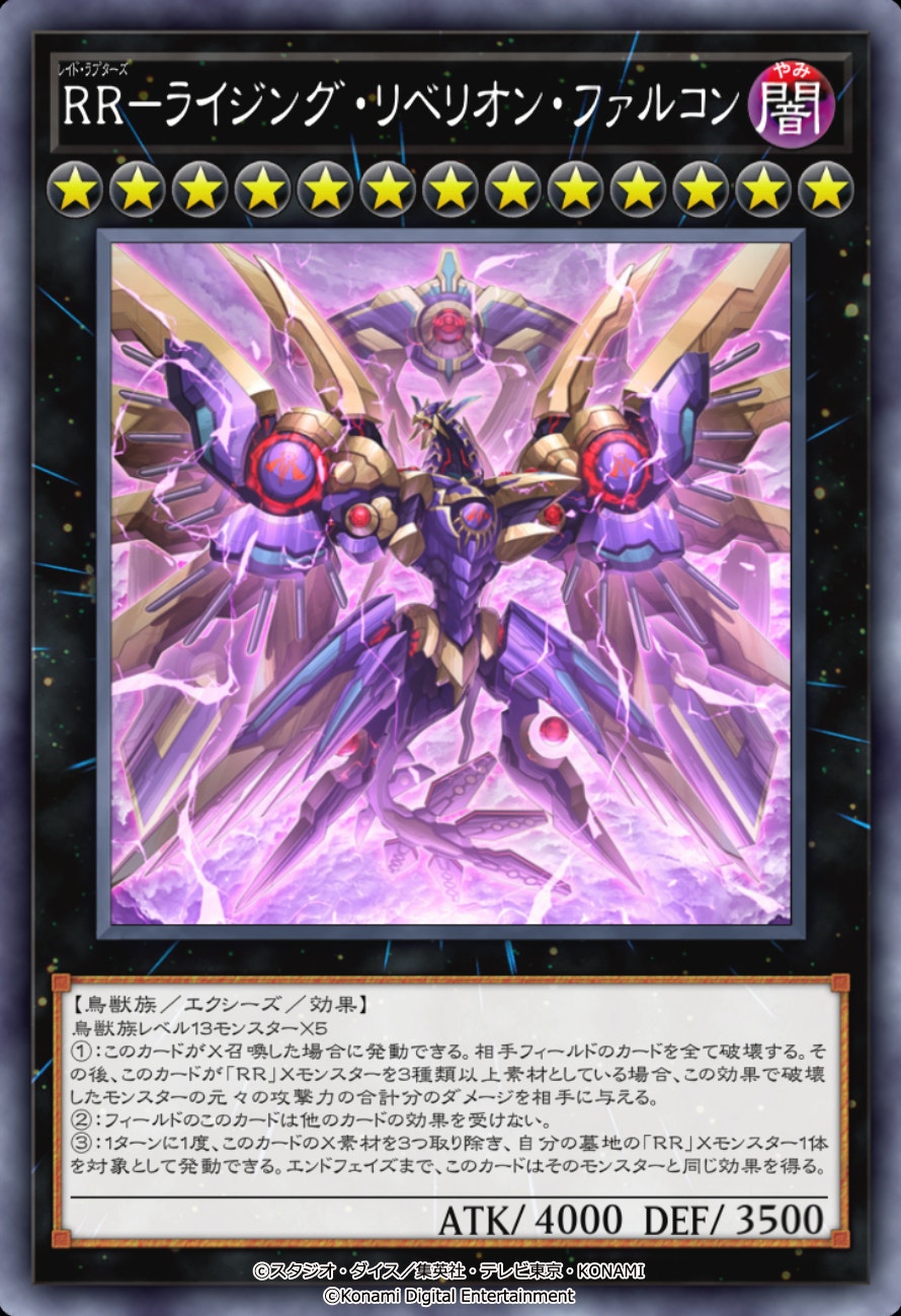 1.:このカードがX召喚した場合に発動できる。相手フィールドのカードをすべて破壊する。その後、このカードが「RR」Xモンスターを3種類以上素材としている場合、この効果で破壊したモンスターの元々の攻撃力の合計分のダメージを相手に与える。