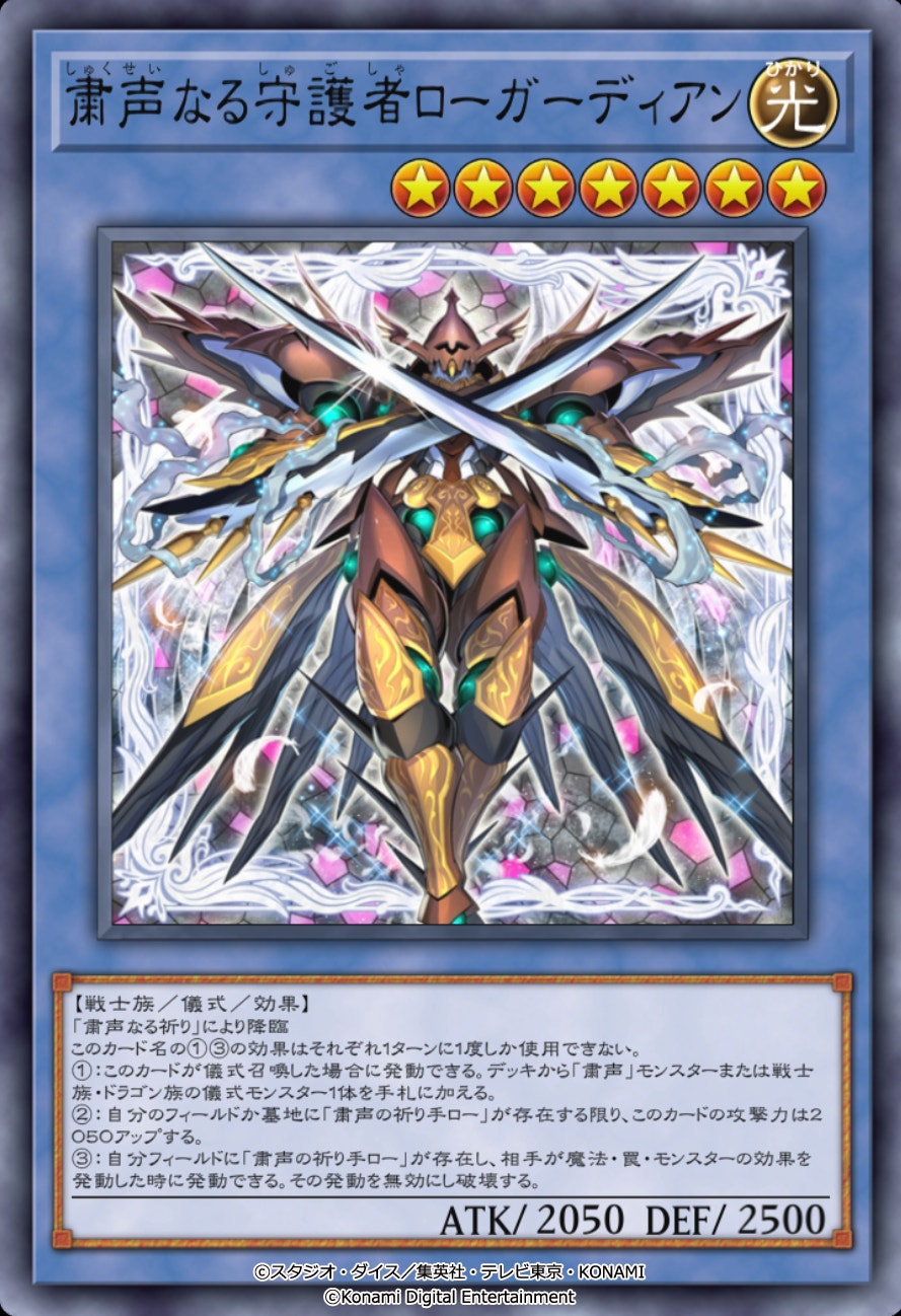 2.:自分のフィールドか墓地に「粛声の祈り手ロー」が存在する限り、このカードの攻撃力は2050アップする。