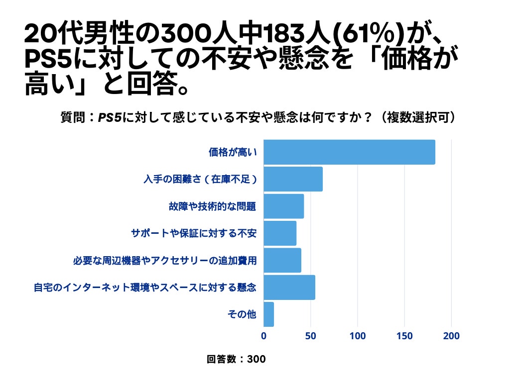 20代男性の300人を対象とした「PS5に対して感じている不安や懸念は何ですか?」というアンケートで183人(61%)が「価格が高い」という結果になりました。