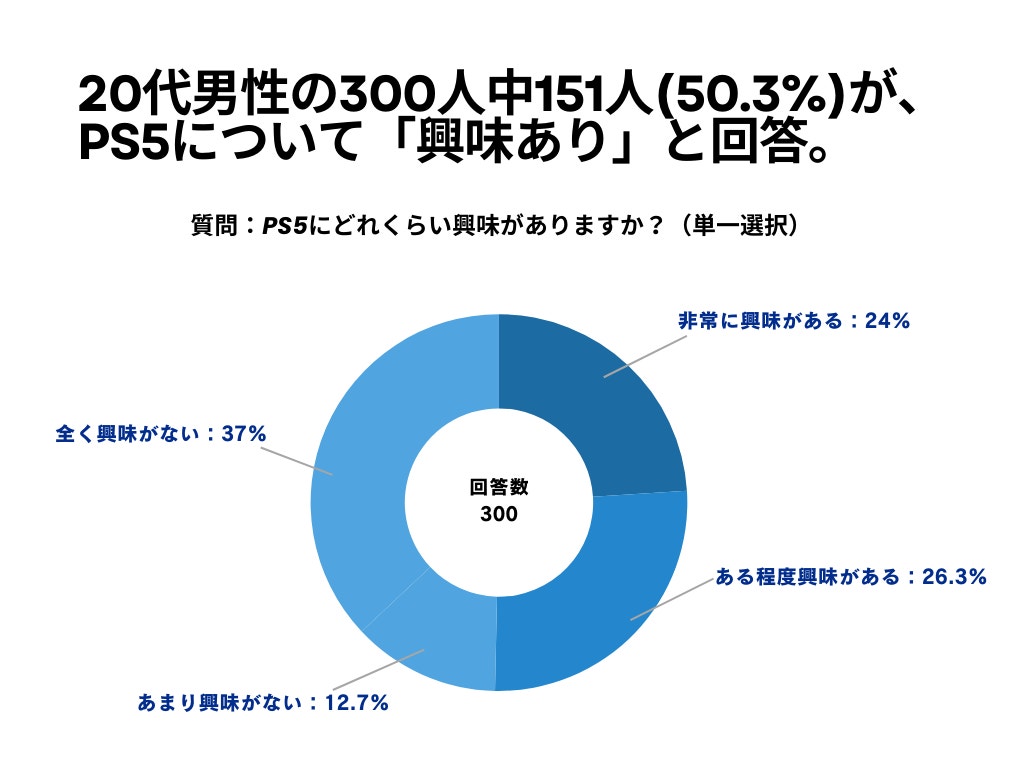 20代男性の300人を対象とした「PS5にどれくらい興味がありますか?」というアンケートで151人(50.3%)が「PS5について興味あり」という結果になりました。