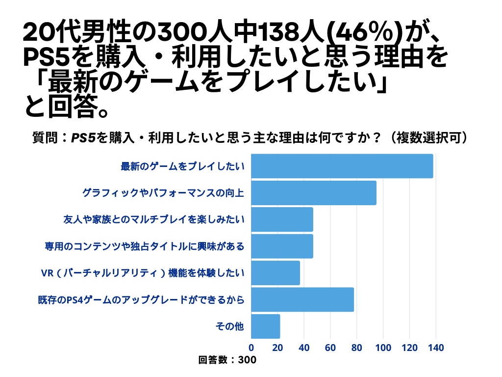 20代男性の300人を対象とした「PS5を購入・利用したいと思う主な理由は何ですか?」というアンケートで138人(46%)が「最新のゲームをプレーしたい」という結果になりました。
