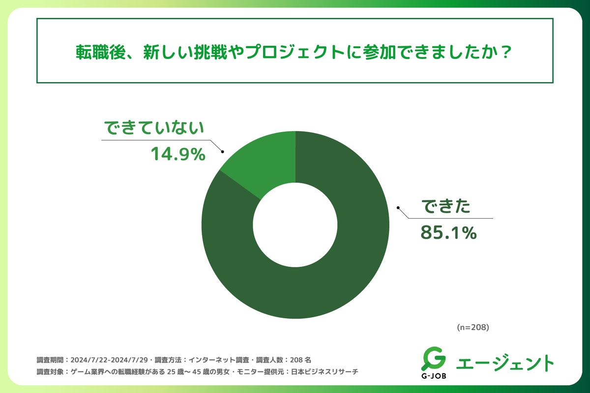 次に「転職後、新しい挑戦やプロジェクトに参加できたか」を問う設問の回答では「できた」が85.1%と大半を占める結果となりました。この結果から、ゲーム業界へ転職した方の多くが新しい挑戦やプロジェクトに参加する機会に恵まれていることがわかりました。