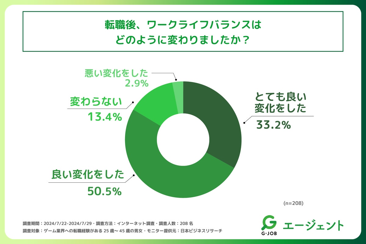 - ゲーム業界に転職された方の8割以上が、転職後、ワークライフバランスに良い変化を感じている