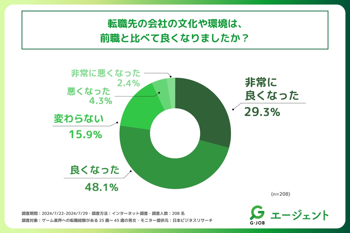 また、「転職先の会社の文化や環境は、前職と比べて良くなったか」を問う設問への回答では「良くなった」が最も多く48.1%、次いで「非常に良くなった」が29.3%で続く形となりました。この2つの合計で回答率は75%を超えており、ゲーム業界へ転職された方の多くが、転職前と比べて会社の文化や環境が良くなったと感じていることがわかりました。