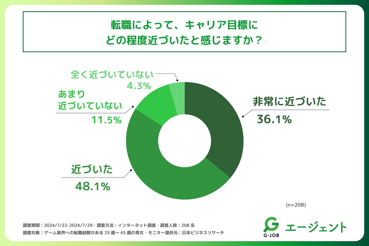 また、調査の最後に「転職によって、キャリア目標にどの程度近づいたと感じるか」を尋ねる設問の回答では、「近づいた」が1位で回答率48.1%、次いで2位が「非常に近づいた」で36.1.%となりました。この結果から前項の設問同様、ゲーム業界への転職後、「キャリアの目標」にも近づいたと実感されている方が多いと明らかになりました。