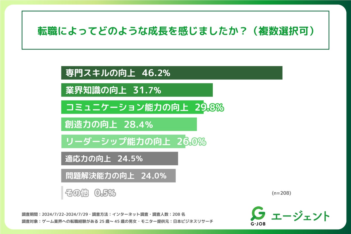 - ゲーム業界への転職後、感じた主な成長は「専門スキルの向上」「業界知識の向上」