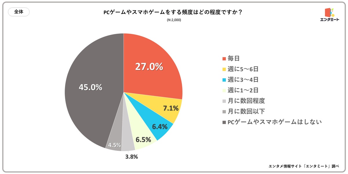 全国の10代~50代の男女を対象に「PCゲームやスマホゲームをする頻度はどの程度ですか?」というアンケートを実施したところ、最も多かった回答は「毎日」で27.0%でした。次いで、「週に5~6日」が7.1%、「週に3~4日」が6.4%で続くという結果になりました。また、「PCゲームやスマホゲームはしない」と回答した人は45.0%となっており、半数近くが日常的にPCゲームやスマホゲームをプレーしていることがわかりました。