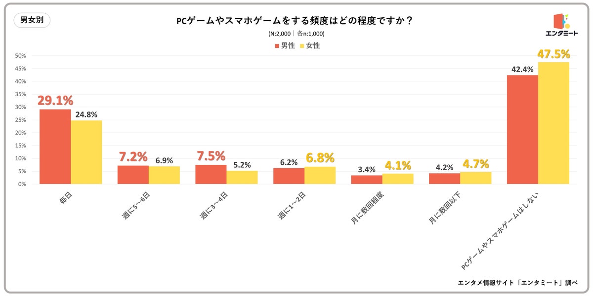 特に、PCゲームをプレーしている人はゲーミングPCを所有しているようなコアゲーマーが多いと推察され、「毎日」と回答した男性が多いことに関係している可能性がうかがえました。