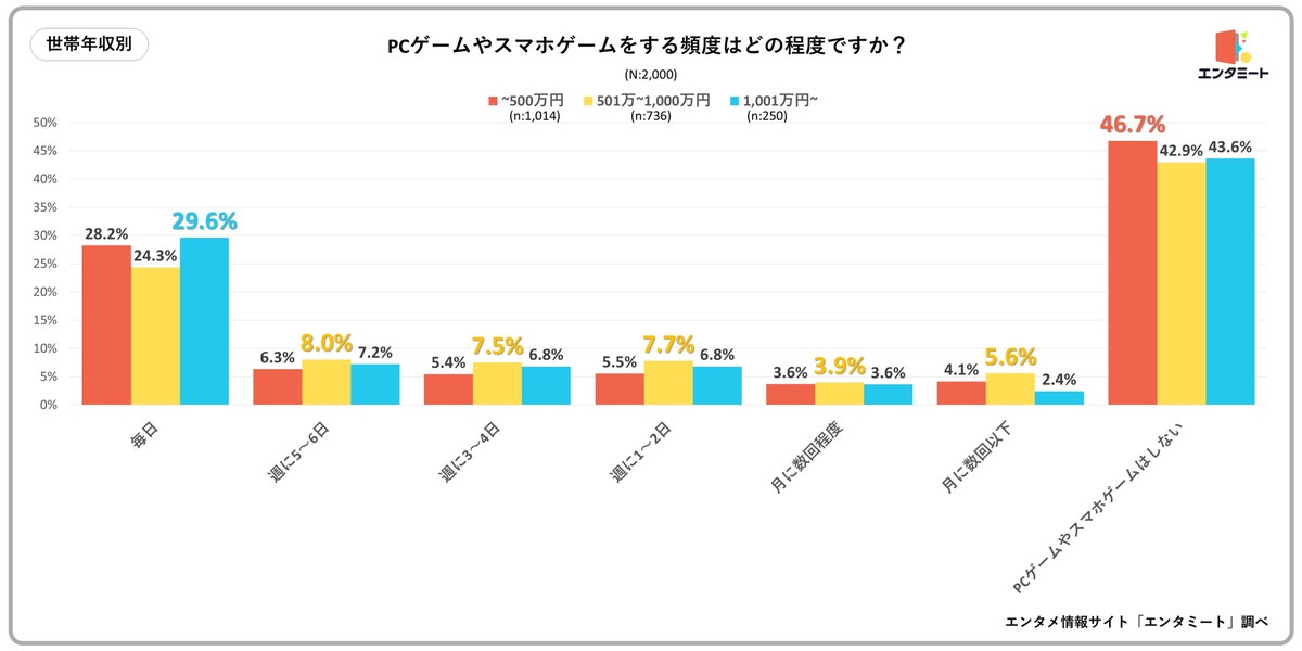 世帯年収別で見ると、PCゲームやスマホゲームをしている人の割合は、世帯年収501万~1,000万円の人がわずかに多いものの、全体的にはほとんど差がないという結果になりました。また、「毎日」と回答した人は世帯年収が~500万円、および1,001万円~でやや多くなっています。近年ではPCゲームでもスマホゲームでも無料でプレーできるタイトルが数多く登場しており、幅広い層がゲームを楽しめるようになっていることがうかがえます。