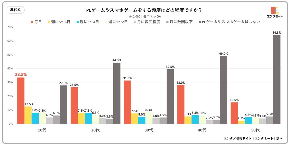 アニメ、映画、ドラマの作品情報や動画配信サービスなどの情報を配信している「エンタミート」が、全国の10代〜50代の男女2,000人を対象にゲームに関するアンケートを実施。