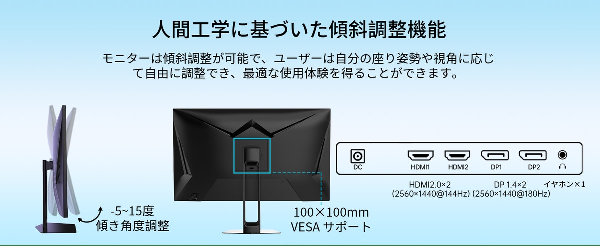 人間工学に基づいた傾斜調整機能により、ユーザーは自分の座り姿勢や視角に応じて、-5度から15度まで自由にモニターを調整可能。最適な使用体験を得ることができます。また、100x100mmのVESAマウントに対応しており、壁掛けやモニターアームにも簡単に取り付けられます。