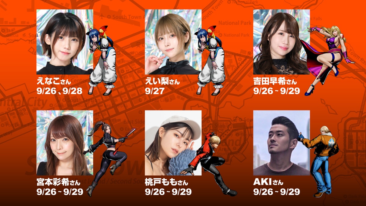 人気コスプレーヤーのえなこさん、えい梨さん、吉田早希さん、宮本彩希さん、桃戸ももさん、そしてモデルのAKIさんが『餓狼伝説CotW』のキャラクターコスプレで参加!また9月26日と9月28日には、『餓狼伝説CotW』コスプレーヤーフォトセッションも開催。SNKブースを華やかに盛り上げます!