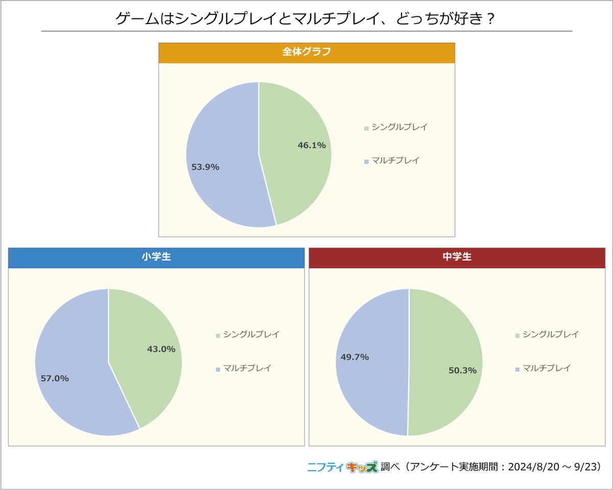 中学生ではシングルプレー派が過半数を超えており、年齢が上がるにつれて一人でのプレーを好む傾向が見られます。