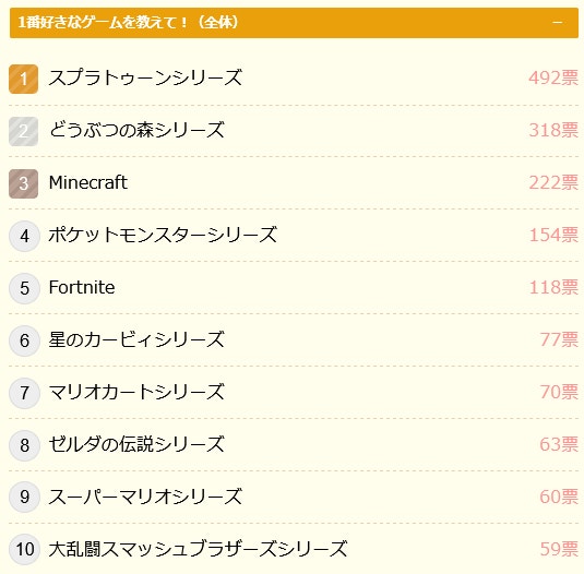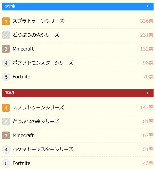 小学生、中学生別のランキングでは、1位~5位までの順位が一致する結果となりました。特に「スプラトゥーンシリーズ」は人気で、全体ランキングでは2位の「どうぶつの森シリーズ」に150票以上の差をつけています。