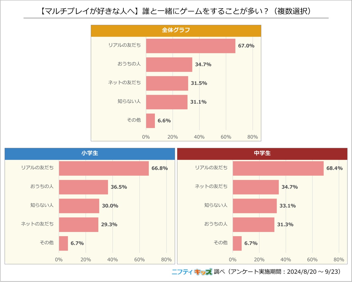 マルチプレーでの相手は、「リアルの友だち」が最も多い結果となりました。小中学生ともに傾向は似ていますが、小学生では「おうちの人」、中学生では「ネットの友だち」が2位と、中学生になるとネットの友だちとの交流がやや増加することがわかりました。
