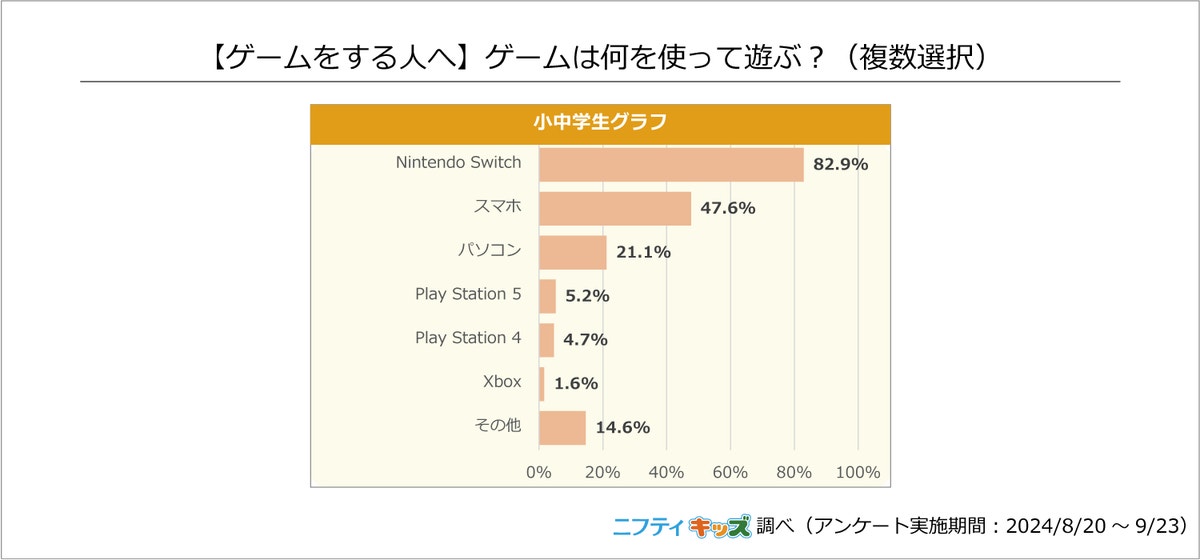 「Nintendo Switch」が82.9%と圧倒的に人気でした。次いでスマホが47.6%、パソコンが21.1%と続きました。家族や友人と気軽に遊びやすい携帯ゲーム機器が人気の傾向にあるようです。