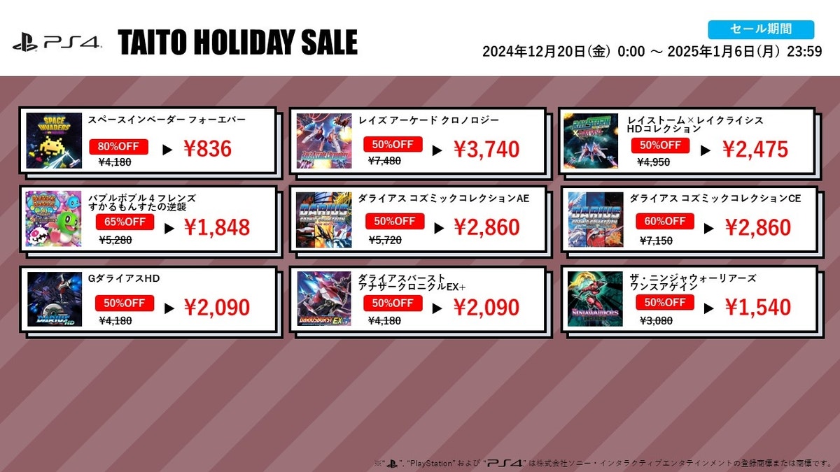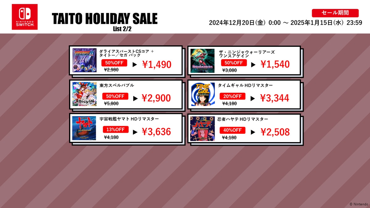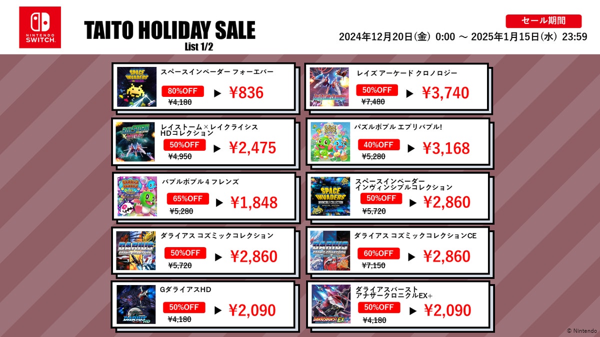 株式会社タイトー(本社:東京都新宿区、以下タイトー)は、対象のNintendo Switch™用ソフト(ダウンロード版)やPlayStation®4用ソフト(ダウンロード版)、Steam用ソフトが最大80%オフとなる「タイトーホリデーセール」を実施いたします。