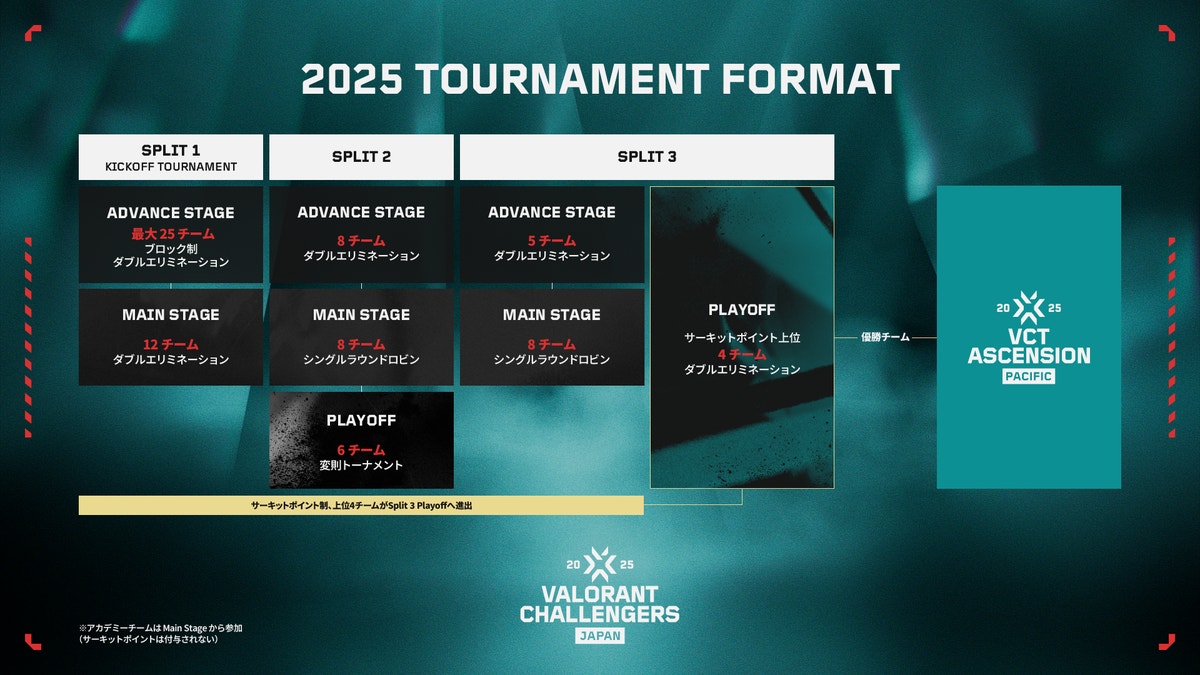 - Split 3: 7月から8月にかけて行われ、3つのSplitを通じてポイントを最も多く獲得した4チームが「VALORANT Challengers Japan 2025 年間王者」の座と「VCT Ascension Pacific」への出場権をかけたオフライン会場でのPlayoffに挑みます。