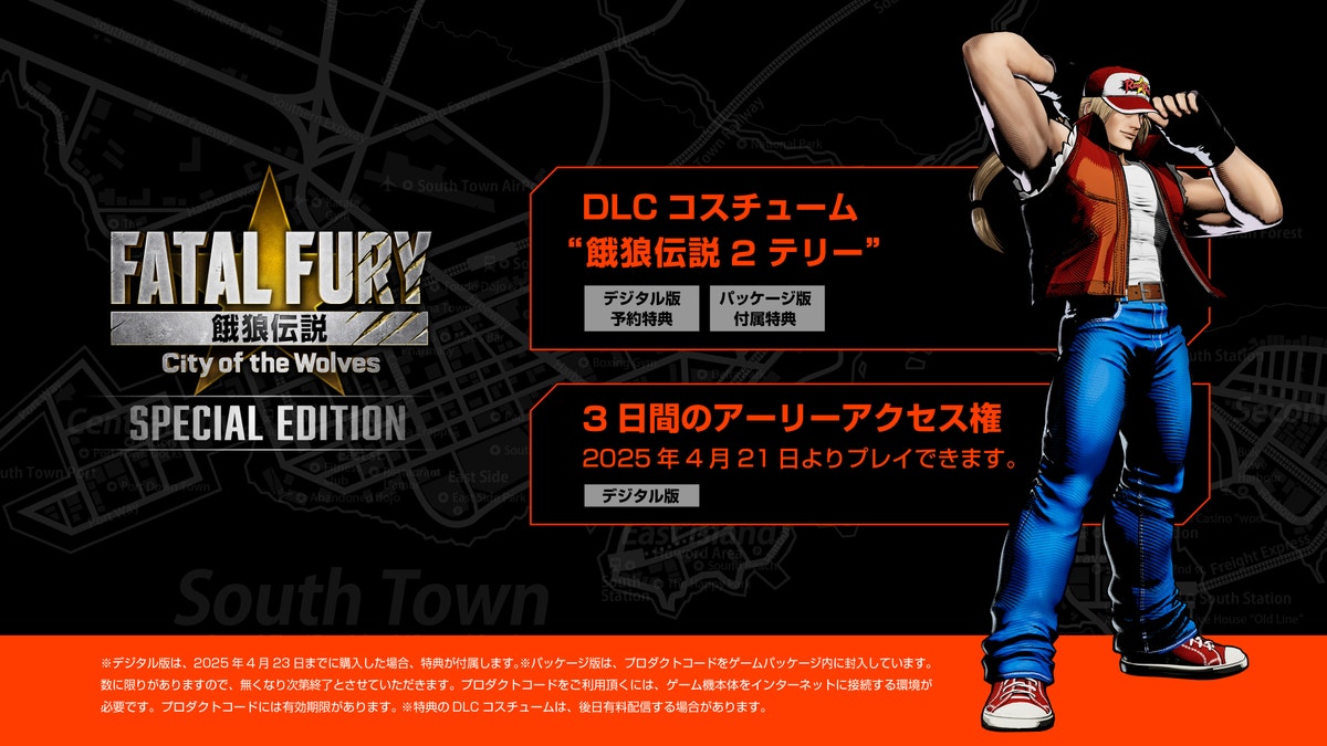 DLCコスチューム“餓狼伝説2 テリー”は、デジタル版では、2025年4月23日までに購入した場合の予約特典です。パッケージ版は、付属特典としてDLCコスチューム“餓狼伝説2 テリー”のプロダクトコードをゲームパッケージ内に封入しています。