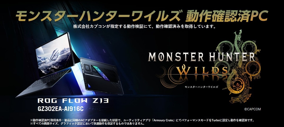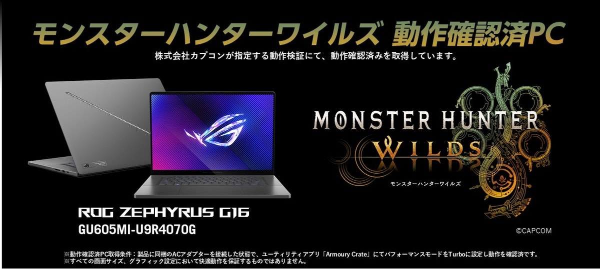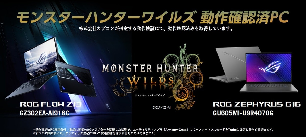 ASUS JAPAN株式会社は、本日2月28日(金)発売のシリーズ最新作「モンスターハンターワイルズ」において、快適にプレー可能な「モンスターハンターワイルズ 動作確認済PC」として、「ROG Flow Z13 GZ302EA-AI916C」および「ROG Zephyrus G16 GU605MI-U9R4070G」を取得いたしました。(株式会社カプコンが指定する動作検証にて、動作確認済みを取得しています。)