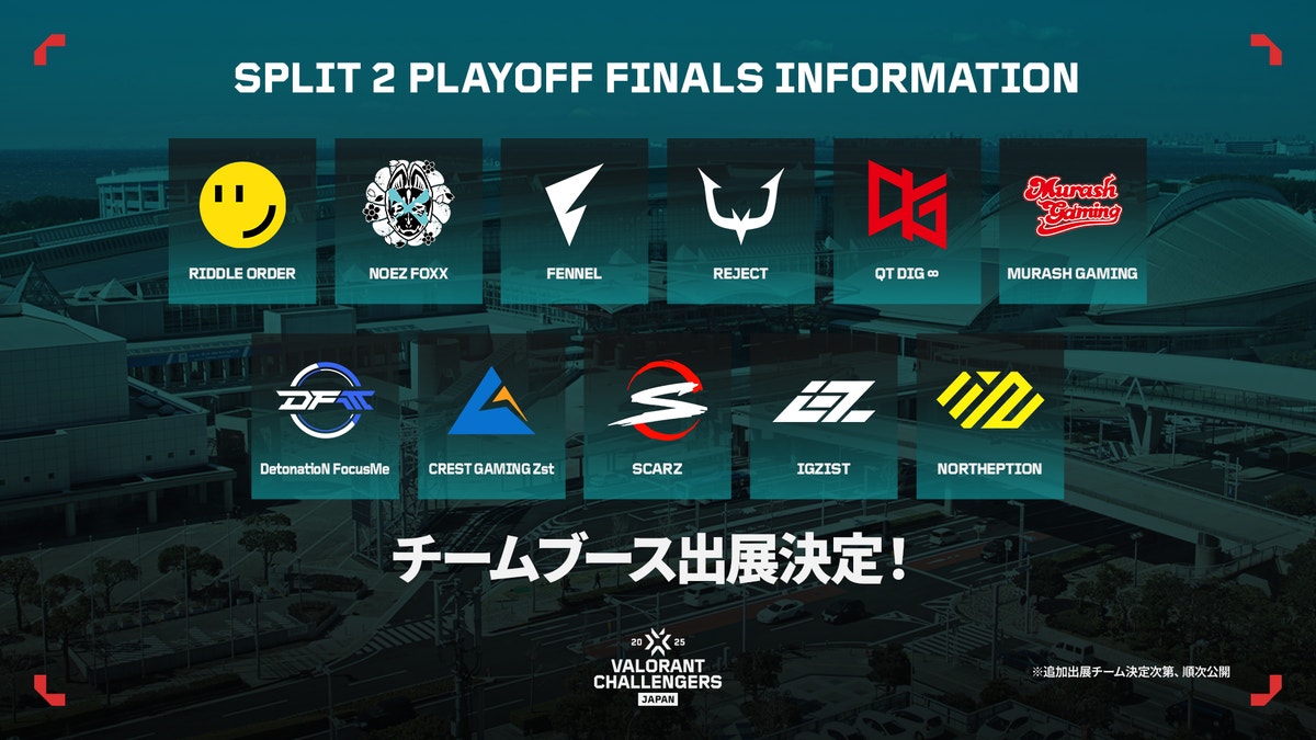VALORANT Challengers Japan 2025実行委員会は、5月17日(土)、18日(日)に幕張メッセで開催する、ライアットゲームズが開発・運営するタクティカルFPSゲーム「VALORANT」の日本最大級のeスポーツ大会「VALORANT Challengers Japan 2025」のオフライン大会「VALORANT Challengers Japan 2025 Split 2 Playoff Finals」に出場する4チームの内、すでに出場を決めている「RIDDLE ORDER」、「NOEZ FOXX」の他、新たに、「FENNEL」、「QT DIG∞」が出場することが決定しましたことをお知らせいたします。
