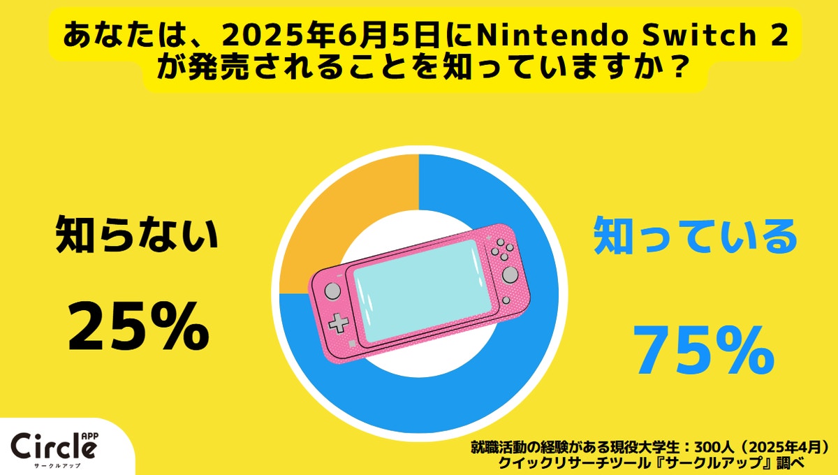 あなたは、2025年6月5日にNintendo Switch 2 が発売されることを知っていますか?という質問に対し知っていると回答した人は75%、知らないと回答した人は25%でした。