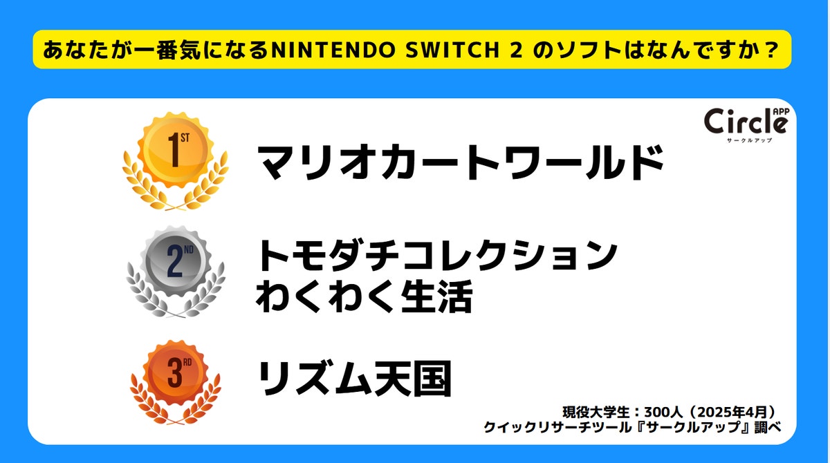 株式会社RECCOO(本社:東京都渋谷区、代表取締役:出谷 昌裕、以下、当社)が運営するZ世代に特化したクイックリサーチサービス『サークルアップ』は、最新のZ世代調査として「Nintendo Switch 2」に関する調査レポートを発表します。今回の調査では2025年6月5日に発売されるNintendo Switch 2対する現役大学生の意識を調査しました。