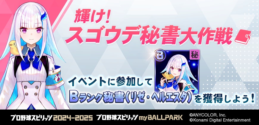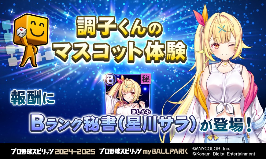 このイベントの開催を記念して、星川サラ、リゼ・ヘルエスタ(にじさんじ所属)、兎田ぺこら、天音かなた(ホロライブ所属)の4名が球団経営モード「myBALLPARK」に秘書役として登場します。