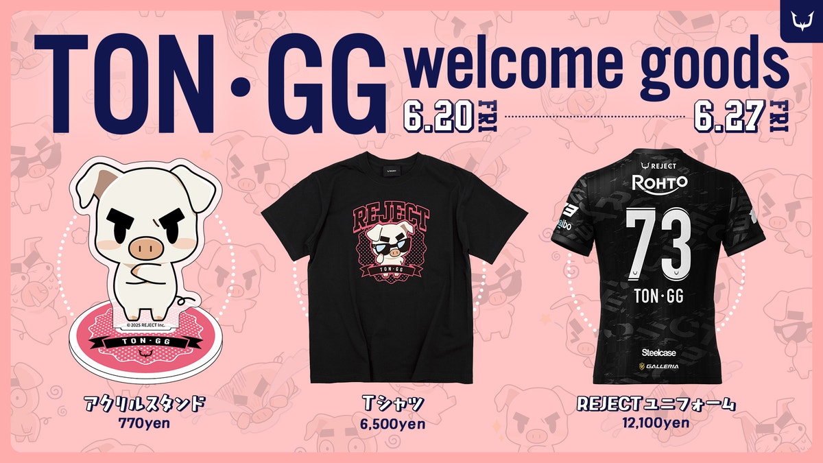 TON・GGのREJECT加入を記念し、「TON・GG WELCOME GOODS」の販売が決定しました。アクリルスタンド・Tシャツ・REJECTユニフォームの3アイテムを展開し、2025年6月20日(金)から6月27日(金)までの期間限定で発売されます。