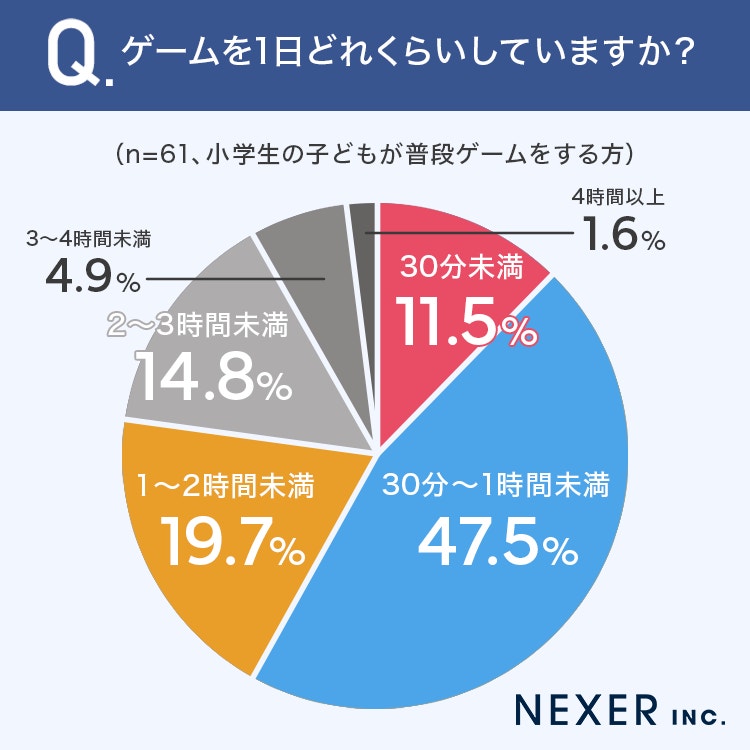 47.5%と半数近くの子どもが「30分~1時間未満」ゲームをしている、と回答しています。