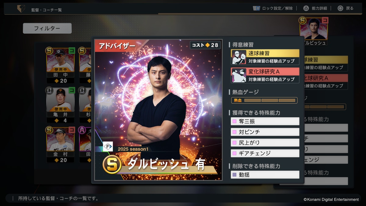 対戦相手にダルビッシュ有選手をメインとした強敵チームが登場します。イベントの報酬としてダルビッシュ有選手をアドバイザー(コーチ)として獲得できます。アドバイザーとして編成することで、SEASONの熱血指導時に“ダルビッシュ有アドバイザー”が持っている特殊能力をほかの選手に伝授することができます。