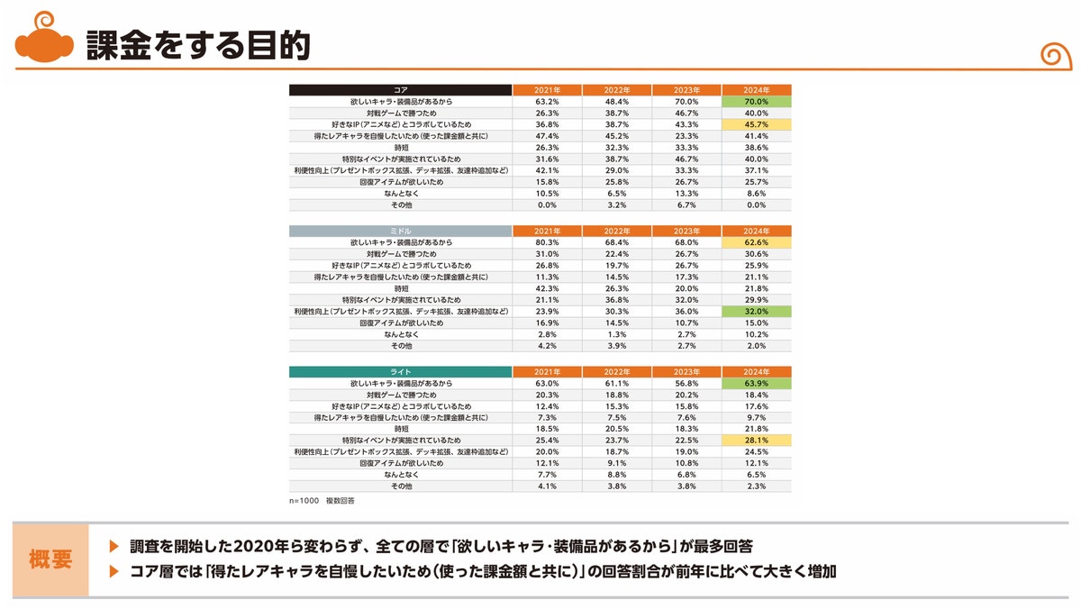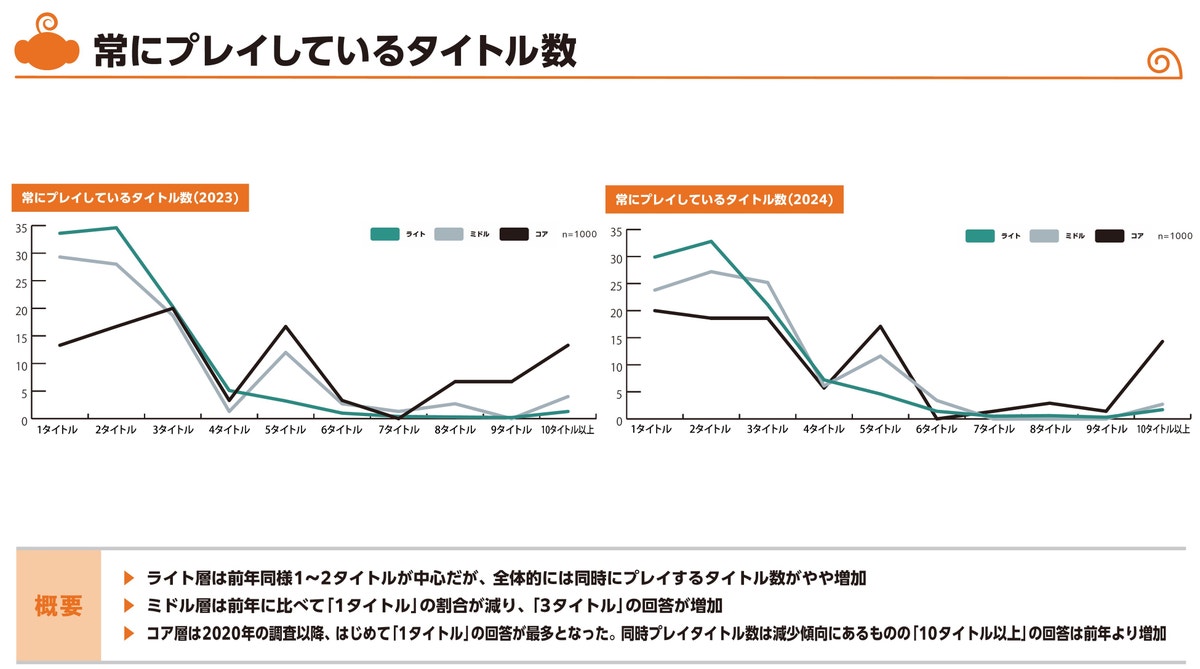 一方、コア層では同時プレータイトル数が減少傾向でした。「短時間で効率良く進められるが、やり込みは深い」といった、"お金を使って楽しめる要素の充実"で、複数タイトルを並行で進めることが厳しくなりつつあるとも推測できそうです。