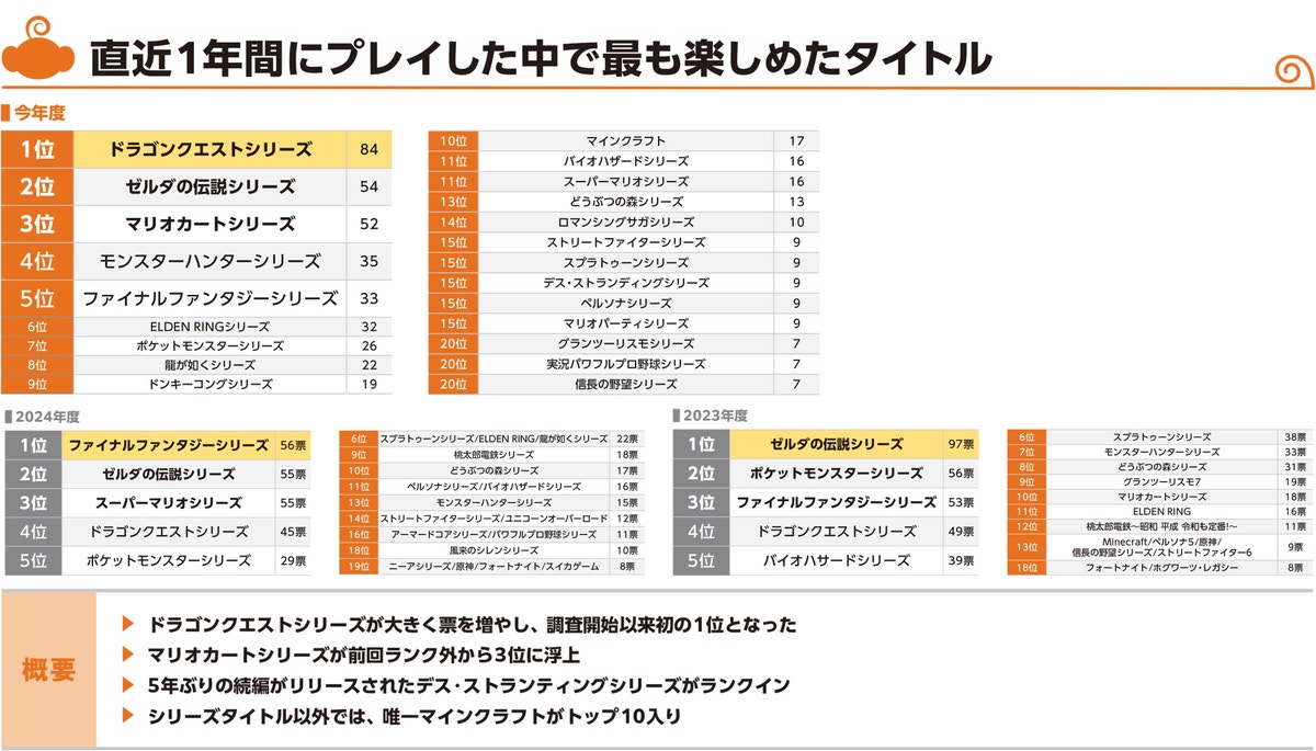 1位となったドラゴンクエストシリーズは、直近での新作は「HD-2D版 ドラゴンクエストIII」だけであったものの、それが多くのユーザーの表を集めた結果となりました。社会現象ともなったオリジナル版の熱狂は変わらず健在です。