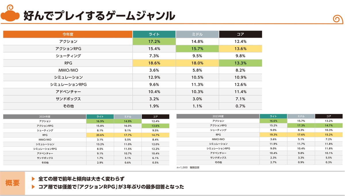ここ数年、好まれるゲームジャンルはユーザーの好みに大きな変化が無く、これはリリースされるタイトルのジャンル傾向にも変化が無い状況とも考えられます。