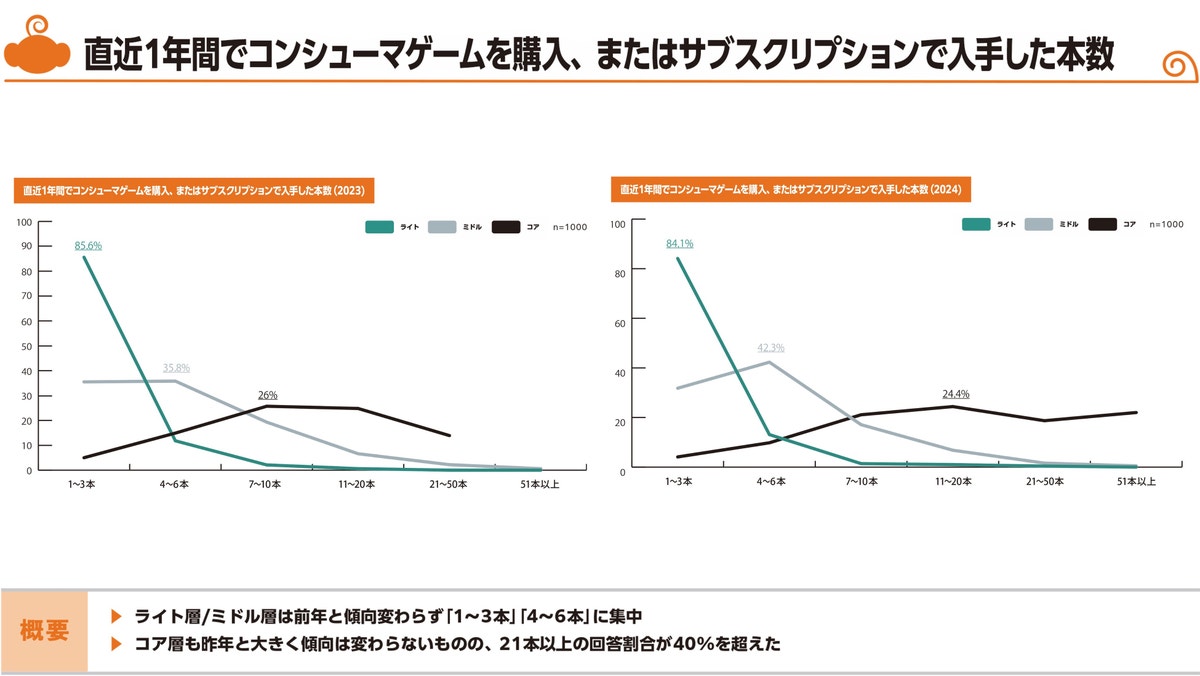 定番、人気ジャンルであるがゆえにインディーズでも求められるクオリティは上がり、コンシューマーゲーム市場は全体的にインディーズを含め、ゲームの価格帯がやや上昇傾向となっています。前年まではコア層だけではなくミドル層でも若干購入本数の増加傾向がありましたが、今回はそれが見られず。価格上昇により購入本数が抑えられていると言えそうです。