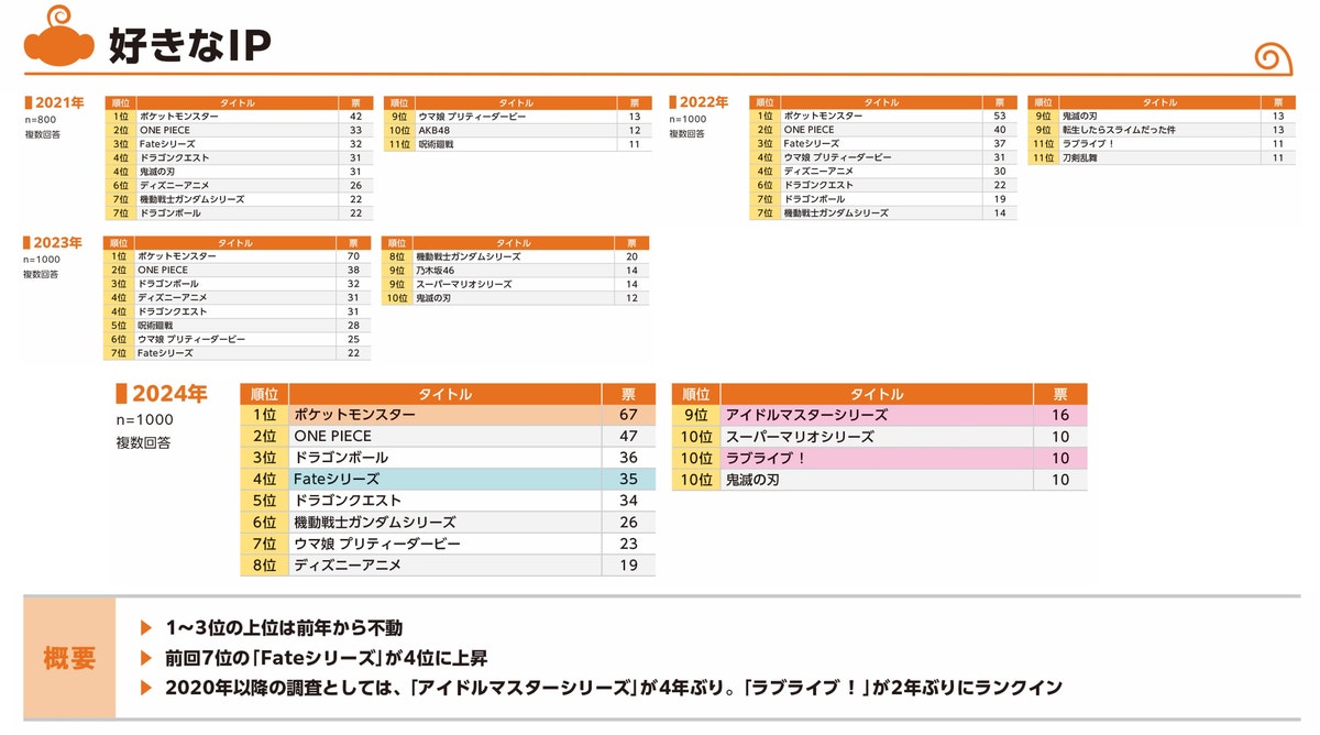 前回7位から4位に順位を上げた「Fateシリーズ」は『Fate/Grand Order』の10周年、圏外からランクインした「アイドルマスターシリーズ」はIP自体の20周年という節目が近いところでさまざまな展開が行われたことが順位アップに繋がっていると言えそうです。