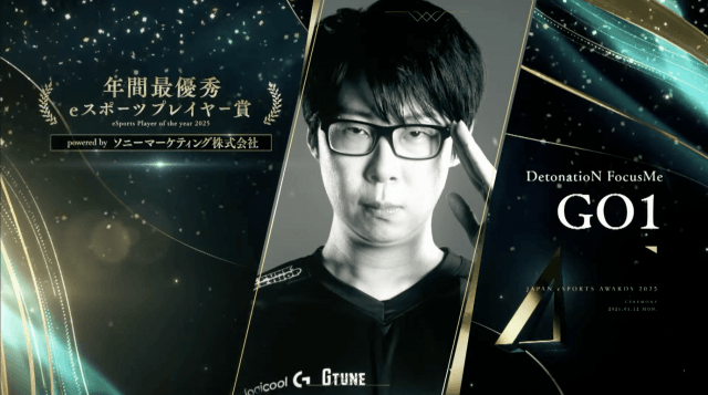 日本国内のeスポーツ界における功績を表彰する、年に一度の祭典「日本eスポーツアワード2025」の授賞式が、2026年1月12日(月・祝)にパシフィコ横浜で行われ、年間最優秀eスポーツプレーヤー賞 powered by ソニーマーケティング株式会社(MVP)にDetonatioN FocusMeのGO1選手が選出された。