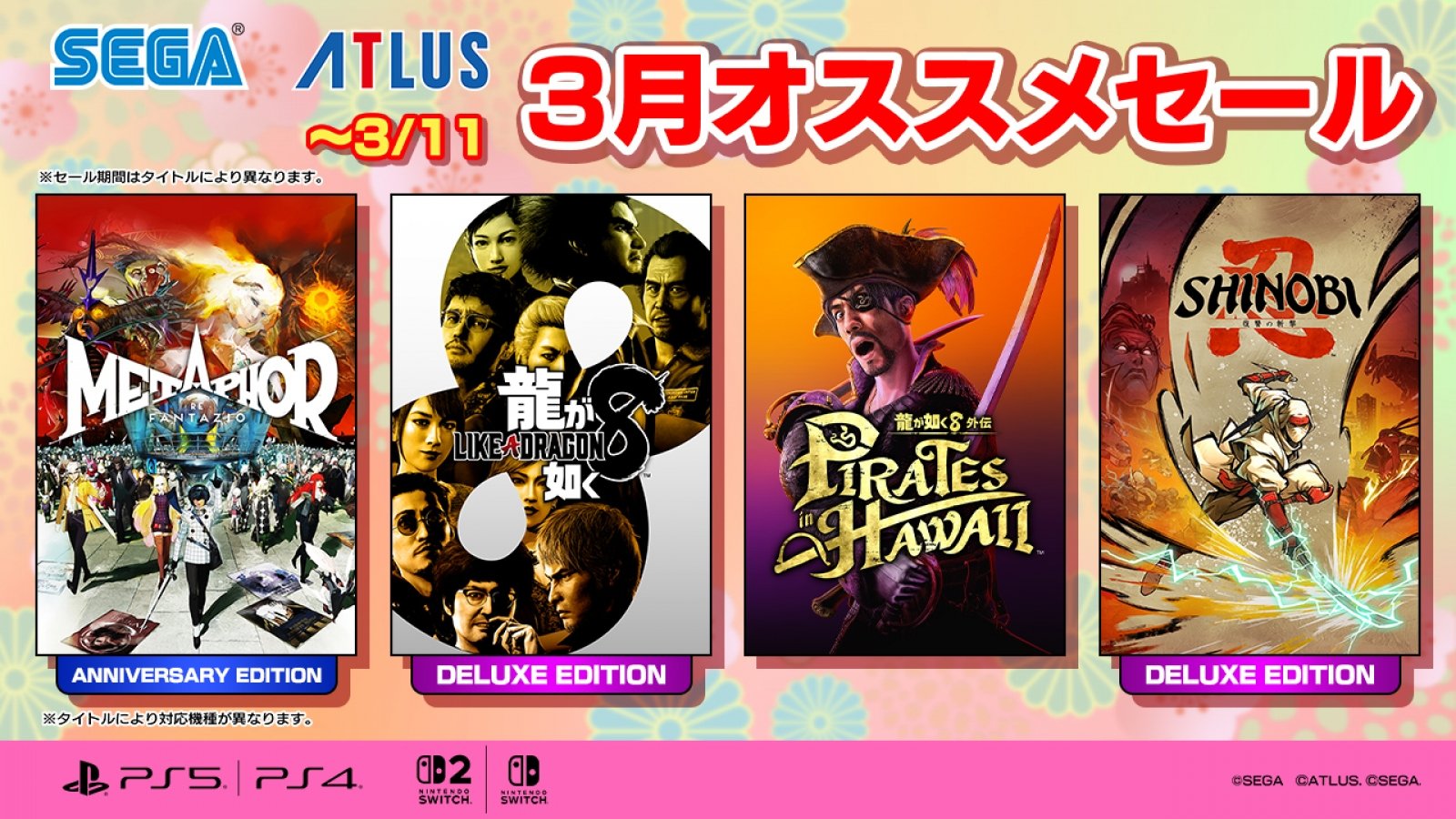 PlayStation Storeおよびニンテンドーeショップにて、セガ、アトラスの人気タイトルが特別価格になる「セガ 3月オススメセール」が開催中。
