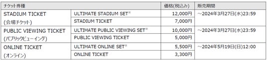 ※ 「ULTIMATE STADIUM SET」、「ULTIMATE PUBLIC VIEWING SET」、「ULTIMATE ONLINE SET」は、CD付きのチケットです。