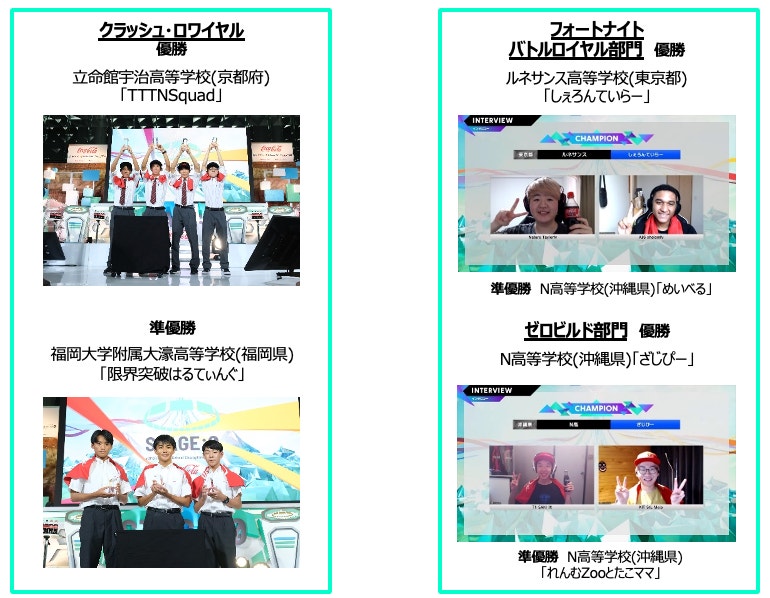 クラッシュ・ロワイヤル部門では、立命館宇治高等学校(京都府)「TTTNSquad」、フォートナイト バトルロイヤル部門ではルネサンス高等学校(東京都)「しぇろんていらー」、フォートナイト ゼロビルド部門ではN高等学校(沖縄県)「ざじぴー」、リーグ・オブ・レジェンド部門ではルネサンス高等学校(神奈川県)「がってぃんてぃんDX」、ヴァロラント部門ではルネサンス豊田高等学校(愛知県)「東京に行くために」、オーバーウォッチ 2部門ではN高等学校(沖縄県)「Telomere」が、栄えある日本一の高校生チームに輝きました。