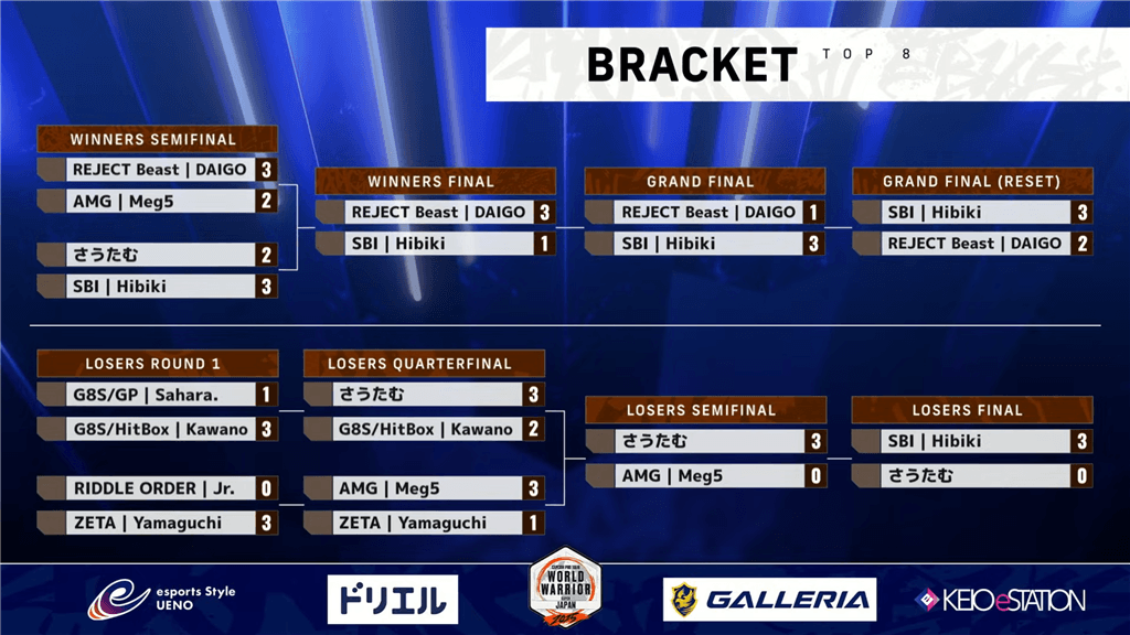 トップ8は、ウイナーズ側はDAIGO(ウメハラ)、ひびき、Meg5、さうたむが勝ち上がり、ウメハラとひびきのウイナーズファイナルでは3-1でウメハラが勝利。ルーザーズ側ではさはら、川野、Jr.、ヤマグチと、チーム所属のプロが名を連ねたが、ウイナーズから降りてきたさうたむにカワノが、Meg5にヤマグチが敗退し、ルーザーズファイナルではひびきが勝利する。