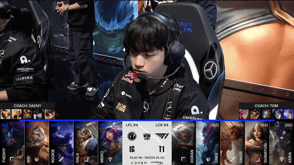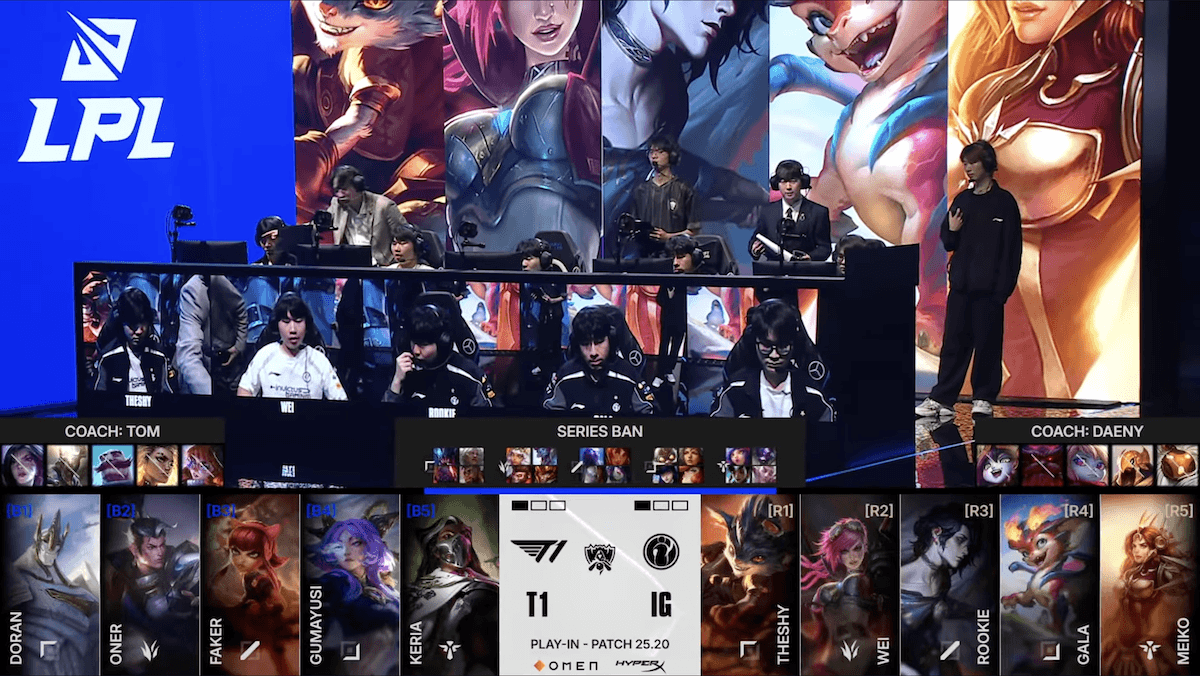 その結果、ともに世界一を取ったチームにもかかわらず、今季苦しんだ2チームが、どちらかが必ず脱落する「プレーインステージ」で戦うという、過去に類を見ない開幕戦となった。会場となった北京のBeijing JD Esports Centerには観客が殺到し、開幕時間が遅れるトラブルもあったほど、地元iGのみならずT1への声援も配信ごしに聞こえてくるほどの盛り上がりを見せた。